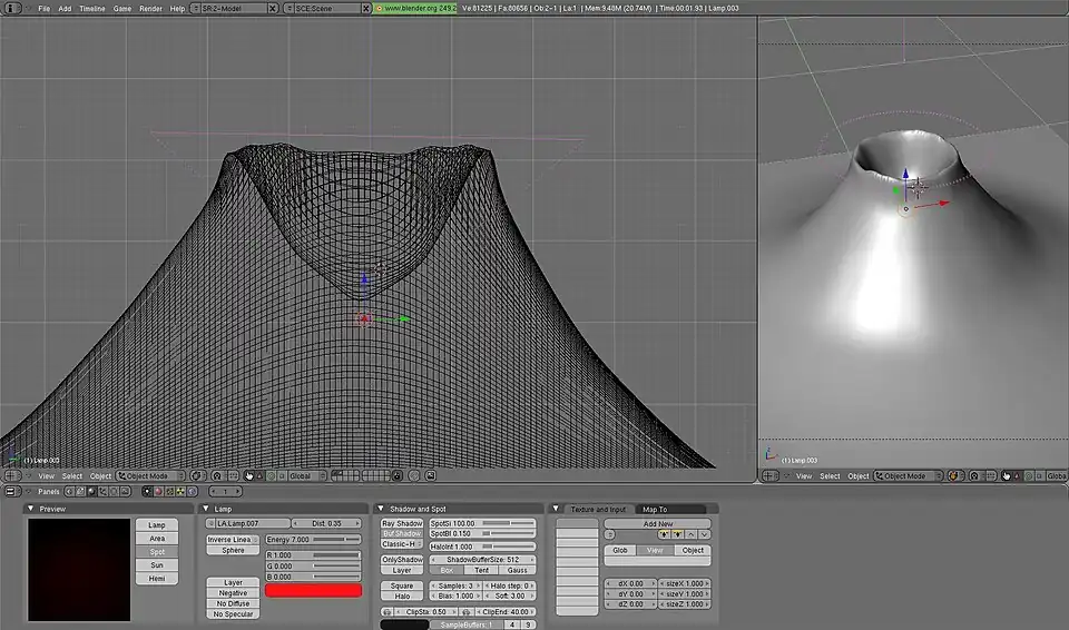 Primeiro, vamos acrescentar algum “magma”. Para ficar parecido como se houvesse magma em nosso vulcão, adicione uma lâmpada (spot). Coloque-a na cratera e ajustar o ângulo e a largura de modo que o furo da cratera seja iluminado. Escolha uma cor vermelha e ajuste a energia que fique brilhante o suficiente.