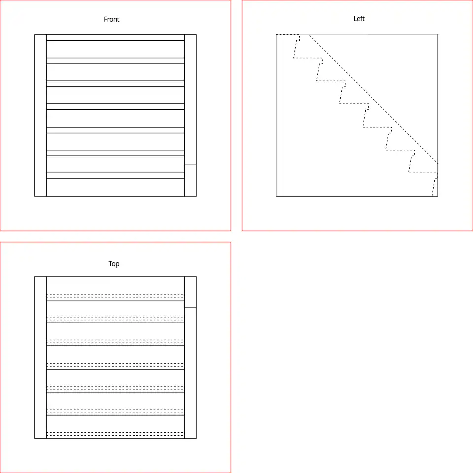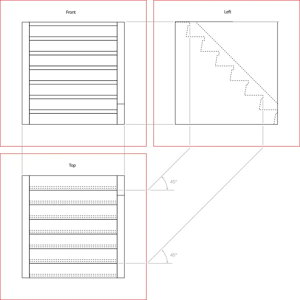 - A vista frontal é ladeada pela lateral (esquerda) e superior. Qualquer linha horizontal na vista lateral irá corresponder a uma linha na vista frontal. Ou seja, se você desenhar as linhas horizontais dos degraus na vista lateral, seus prolongamentos corresponderão às linhas dos respectivos degraus na visão frontal também. Da mesma forma, se você estender a linha vertical da parede esquerda da escadaria na vista superior, ela coincidirá com o início da mesma linha da parede na vista frontal. Tendo em mente estas propriedades, é bastante simples compreender as características do objeto representado na vista frontal.