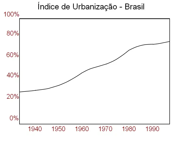 As pessoas, na desordem, começaram a ir do campo à cidade, as malhas urbanas cresceram, descontrolavelmente. Isto foi o Êxodo Rural. Abaixo, o gráfico do índice de urbanização em um país em desenvolvimento (um país em desenvolvimento, em sua história, é variavel o Índice de Urbanização):