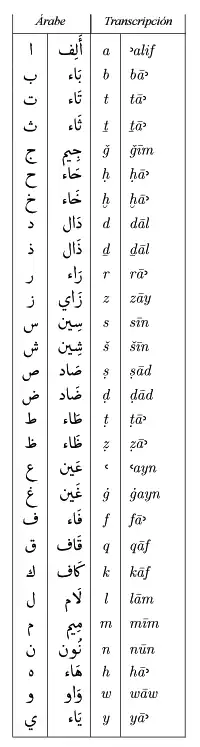 O alfabeto árabe é constituido de 28 letras. Apesar da utilização do termo alfabeto, esse sistema é um consonatário (ou abjad), no qual existem apenas consoantes. Os sons vocálicos são dados por diacríticos, sinais utilizados acima ou abaixo das letras. O alfabeto (consonatário) árabe é constituido das seguintes letras: