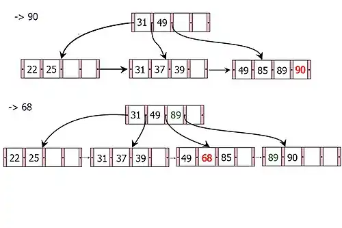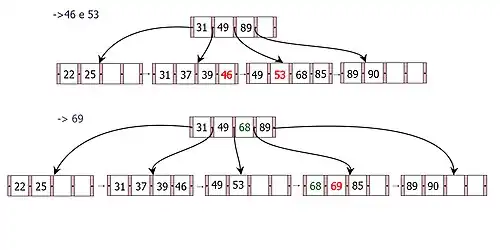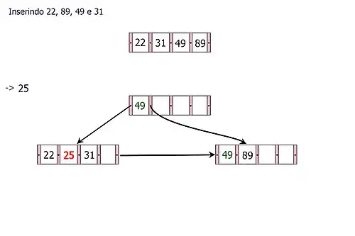 - caso ocorra divisão da página, a chave deve ser mantida na folha e copiada para cima (divide se a página ao meio e sobe o menor valor criado da nova página da direita)