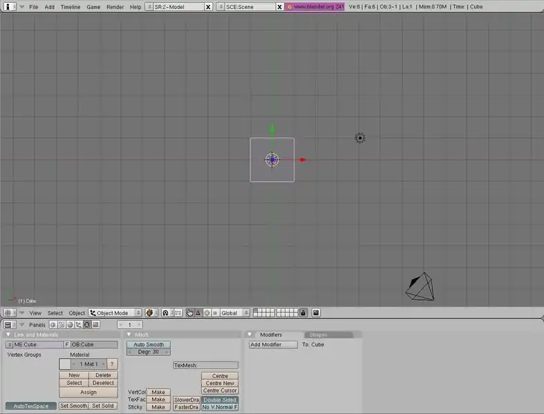 Agora nós vamos adicionar um objeto Mesh (uma malha é a base para muitos modelos 3D). Supondo que você esteja modelando um personagem, seria útil criar apenas um lado, e automaticamente criar o outro lado. Para fazer isso, nós vamos espelhar a malha (mesh):