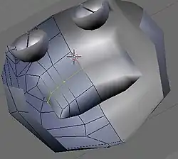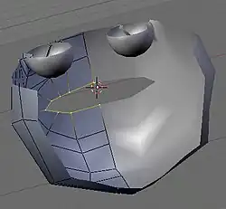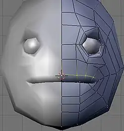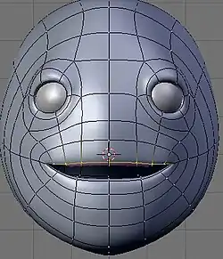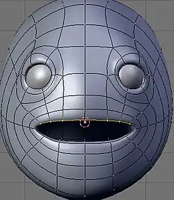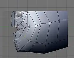 - Desligue o Subsurf na Edit Mode, usando os botões do modificador. Agora nós podemos ver a jaula de edição subjacente. Note que o lábio superior da jaula de edição parece estar sobrepondo o lábio inferior. Você pode mesmo ver algumas das vértices do lábio inferior, porque elas estão cobertas pelo lábio superior.
