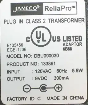 Verifique se o símbolo na parte inferior da etiqueta está presente. Isso significa que a parte externa do plugue é negativa e a interior é positiva. Um plugue de centro-negativo não irá funcionar com o Arduino.