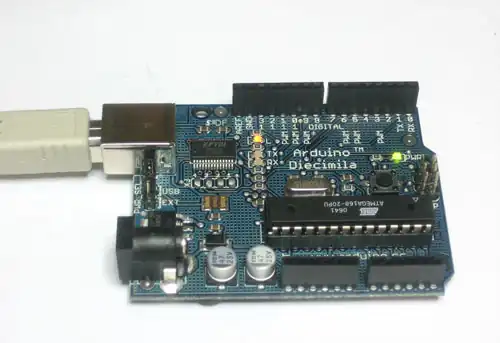 Você deve enxergar uma pequena luz verde no lado direito do Arduino, como mostrado aqui.