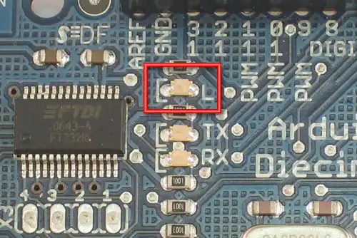 Se você lembrar da lição 1 o usuário do Arduino NG tinha que ter certeza que inseriu o LED na posição correta, se o colocasse invertido não funcionaria. O usuário do Arduino Diecimila já tem o LED (muito pequeno) soldado na posição correta.