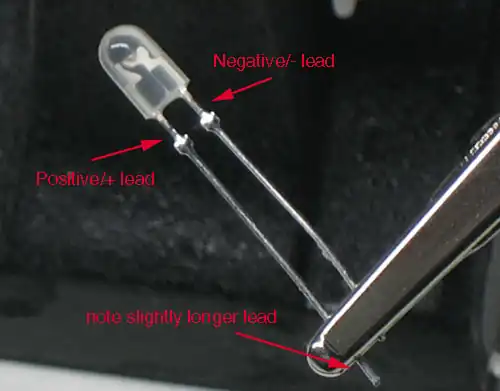 É bem simples saber qual perna do LED é positiva (ânodo) e qual é negativa (cátodo), a positiva é ligeiramente maior e se você olhar atentamente dentro dele a parte negativa tem um pedaço maior de metal.