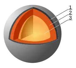 A densidade de Mercúrio pode ser utilizada para inferir detalhes de sua estrutura interna. Enquanto a alta densidade terrestre resulta consideravelmente da compressão gravitacional, particularmente no núcleo planetário, Mercúrio é muito menor e suas regiões internas não são tão fortemente comprimidas. Portanto, para ter a densidade que apresenta, seu núcleo deve ser relativamente maior e rico em ferro. Os geólogos estimam que o núcleo de Mercúrio ocupe aproximadamente 42% de seu volume, enquanto na Terra a proporção é de 17%. Pesquisas recentes sugerem que seu núcleo seja fundido. O núcleo é cercado por um manto com 500–700 km de espessura constituído de silicatos. Baseado nos dados da missão da Mariner 10 e de observações terrestres, acredita-se que a crosta do planeta tenha entre 100 e 300 km de espessura. Um dos detalhes característicos da superfície do planeta é a presença de numerosas cristas estreitas, que podem se estender por centenas de quilômetros. Acredita-se que essas estruturas foram formadas quando o núcleo e manto se resfriaram e contraíram, numa época em que a crosta já estava solidificada.