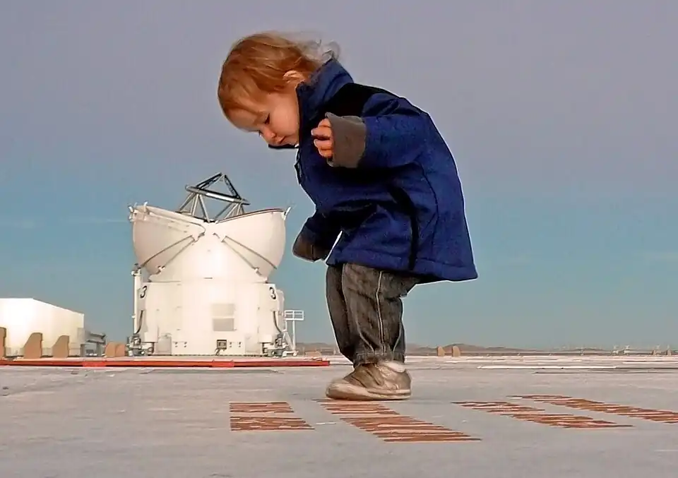 Foto tirada no ESO Very Large Telescope no Chile. A filha do astrônomo Julien Girard, Maëlle na perspectiva da foto torna o enorme telescópio um brinquedo.