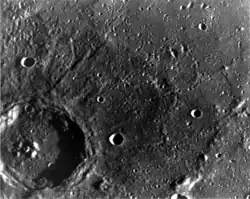 Mercúrio tem crateras como aquelas que existem sobre a lua da Terra. A maior cratera em Mercúrio é a Bacia Caloris. Ela tem cerca de 1300 km de largura e deve ter sido criada pela colisão de um enorme asteroide.
