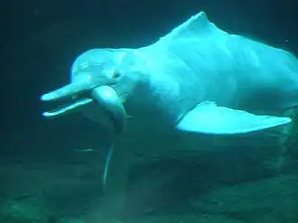 A cor do corpo do boto muda com a idade. Normalmente, ele é cinza escuro quando filhote, depois vai ficando de um cor-de-rosa cada vez mais vívido até começar a desbotar e ficar quase branco.