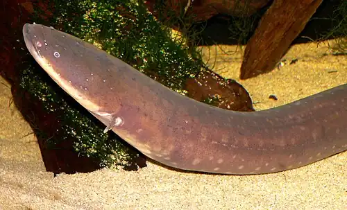 O corpo do Poraquê é alongado e tem uma grande nadadeira por baixo da barriga. A cabeça é achatada e na boca ele tem uma fileira de dentes muito afiados.