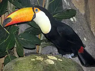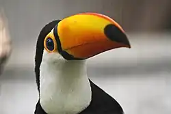 Os tucanos grandes, como o da foto acima que é o tucano toco, são os maiores representantes da espécie. Ele é alaranjado, amarelo e branco, com a mancha preta no bico. Em volta dos olhos é laranja ou amarelo e as pálpebras são azuis. A garganta e o peito são brancos e o resto do corpo de penas negras, sendo que por baixo do rabo tem penas vermelhas. Os pés do tucano são cinza-azulados.