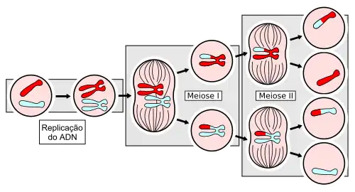 A meiose consiste em duas divisões celulares, resultando em quatro células. Na primeira divisão ocorre crossover genético e as características codificadas nos cromossomos são misturadas. A célula efetua uma profase normal, entrando então em metafase, na qual se inicia o crossover, e procede depois de forma normal pela anafase e telofase.