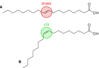 Já uma configuração trans, por sua vez, significa que os dois átomos de carbonos em ambas as extremidades da dupla ligação estão do lado oposto. Como consequência, não há dobramento de cadeia, e sua conformação é muito semelhante a de um ácido gordo saturado.