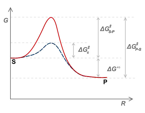 O equilíbrio que existe entre S e P depende da diferença entre os seus estados fundamentais de energia e é igual a ΔG'º. Se a energia do estado fundamental de P for menor que a de S, o equilíbrio SP é favorável à formação de P. Por muito elevada que seja essa diferença, S não é convertido a P a uma velocidade apreciável, ou sequer detectável, se a energia do estado de transição for muito elevada.
