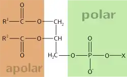 Um dos principais componentes estruturais da membrana celular são os fosfolípidos. Os fosfolípidos mais comuns são os glicerofosfolípidos, compostos por dois ácidos gordos e um grupo fosfato ligados a uma molécula de glicerol por ligações éster, à semelhança do que acontece com os triacilgliceróis. Existe ainda um grupo polar adicional ligado ao glicerol através do fosfato: esta ligação ao glicerol é, mais especificamente, uma ligação fosfodiéster. Existem também os esfingolípidos, que utilizam esfingosina em vez de glicerol (e contêm apenas um ácido gordo). No entanto, nem todos os esfingolípidos possuem um grupo fosfato (ou seja, nem todos são considerados fosfolípidos).