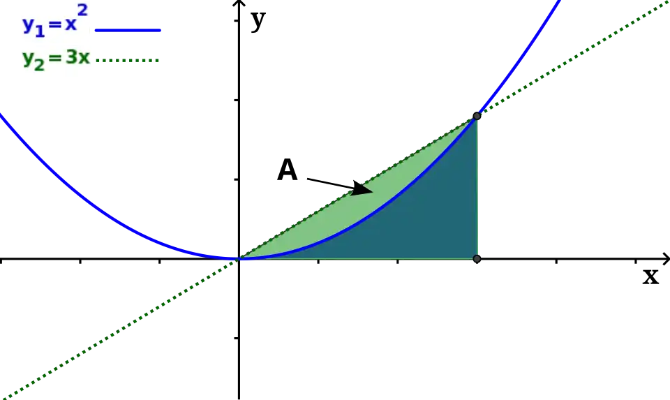 Obviamente devemos proceder a subtração entre a área delimitada pela reta e a área delimitada pela parábola, no caso da reta poderíamos ainda fazer a área do triângulo formado pela mesma e o eixo das abscissas, porém façamos todo o processo utilizando integração para que possamos ter um processo universal para o cálculo de áreas desse tipo.