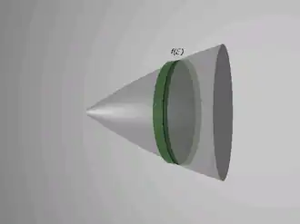 Temos a função variando ao longo do eixo x, o que nos permite dizer que uma reta perpendicular ao eixo que passa por um ponto do gráfico é um raio de um disco... Em um intervalo onde , no qual , agrupemos pares de valores nas abscissas, de forma que o valor médio da função seja . Tomando cada disco com um volume aproximado de: