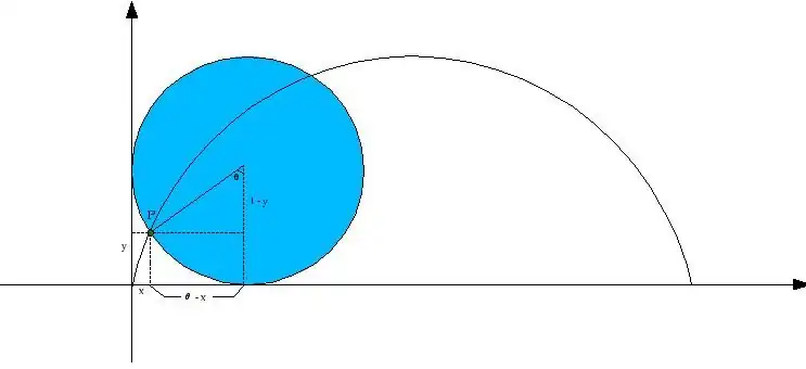 O ciclóide é formado pelos pontos que seguem o contorno da curva formada pelo movimento do disco sobre a superfície, de forma que o ponto (P) esteja fixado a um ponto da circunferência do disco, neste gráfico consideramos o raio unitário. Porém, se o raio é uma constante (c), e observamos o triângulo inscrito no disco, no qual podemos notar a distância do ponto (P) à superfície, que corresponde ao subsegmento da circunferência, veremos que esta é: , onde corresponde ao raio constante, o que nos dá: