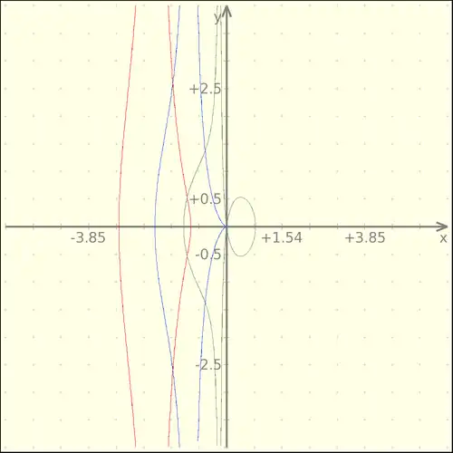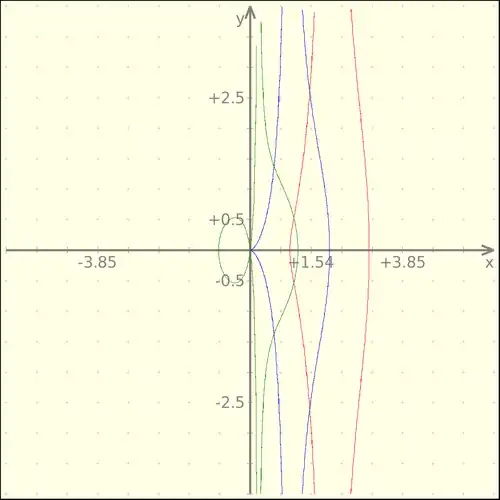 Note que quanto mais se aproxima do eixo das ordenadas a conchóide tende a criar uma nova concha do lado oposto ao que está se desenvolvendo. |
