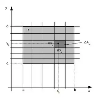 Como para integrais simples, integrais duplas são definidas como o limite de somas de Riemann. Para tanto, particionamos a região retangular em subretângulos e denotamos a área do -ésimo subretângulo por , onde e são os comprimentos dos lados deste subretângulo. Uma soma de Riemann é dada por: