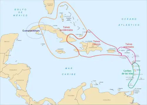 Os povos de línguas aruaques são originários da região da atual fronteira entre Brasil e Venezuela. Dessa região, se expandiram em todas as direções, atingindo regiões como a atual Flórida, a Bolívia, a ilha brasileira de Marajó e o noroeste argentino. No início da era cristã[1], os tainos, um povo de língua aruaque, ocuparam as ilhas do Caribe, submetendo à escravidão os habitantes originais, chamados siboneys ou guanahatabeys. Os tainos dividiram a região em unidades administrativas conhecidas como cacicados.