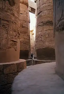 Para ter uma idéia das dimensões dos capitéis de Karnak, basta pensar que em cada um deles podem estar cem pessoas de pé. Esta sala representa simbolicamente uma gigantesca floresta de papiro.