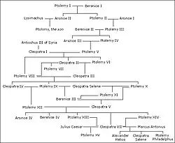 No reinado de Cleópatra VII, filha de Ptolomeu XII se deu outra intervenção romana. Embora a rainha fosse uma governante capaz politicamente, ela foi envolvida na luta pelo poder entre os romanos Otavio Augusto e Marco Antonio e escolheu ficar do lado errado. Derrotada junto com Marco Antonio na batalha do Accio, Cleópatra cometeu suicídio.