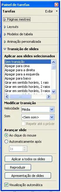 - Clicar no slide desejado e, depois clicar no Painel de Tarefas -> Transição de slides. Na janela Efeitos de Transição selecionar os efeitos. Para melhor seleção e visualização dos efeitos de transição na versão 2.0.1, deslocar o Painel de Tarefas fora da área de encaixe.