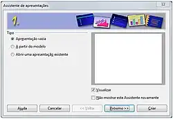 Na sequência aparecerá uma tela principal do Assistente do BROffice.org vrs Impress que permitirá que o usuário crie uma apresentação vazia ou com uma formatação pré-existente (a partir de um modelo) ou que o usuário abra uma apresentação já existente.