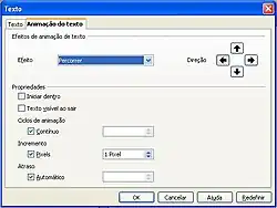 Pode ser aplicado efeito no texto inserido na caixa como: piscar, percorre, rolar para frente e para trás e rolar para dentro. Para isto, selecionar a caixa de texto e clicar no menu Formatar -> opção Texto. Na caixa de diálogo Texto, clicar na Guia Animação de Texto escolher o efeito e a posição para ocorrer o evento.