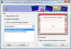 Apresentação a partir do modelo: disponibiliza as opções Apresentar um novo Produto ou Recomendar uma estratégia. Através do Assitente o usuário poderá criar a apresentação passo-a-passo e fornecer dados para a confeccção da apresentação e com todas as informações montará um layout.