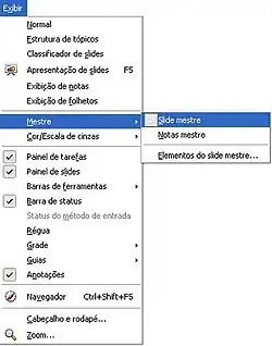 - Visualizar o slide mestre, para isto, clicar no menu Exibir->Principal->Slide Mestre.