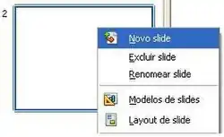 - Clicar com o botão direito do mouse em cima do Painel de slide,esta ação disponibilizará um menu suspenso permitindo entre outras opções a inclusão de um novo slide.