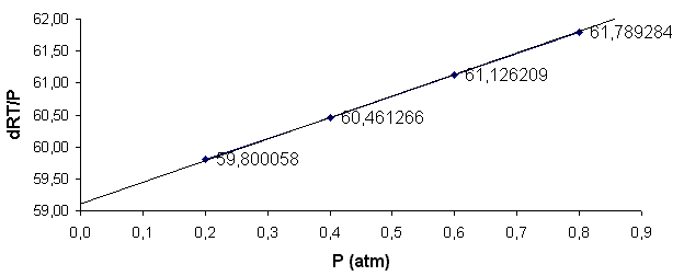 Obtém-se um resultado que depende da pressão, o que mostra que o gás não é perfeito. Sabemos que um gás tende a ter as propriedades do gás perfeito quando a pressão tende para zero. Em conseqüência, M tende para dRT/P quando P tende para zero. Há duas maneiras de resolver o problema: a extrapolação gráfica ou a regressão linear.