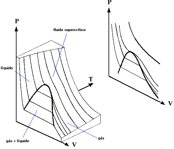 Podemos representar as diversas regiões do gás , do líquido e do fluido supercrítico num diagrama a três dimensões P(V,T) cujos diagramas P(V) a seguir são as projeções num plano: