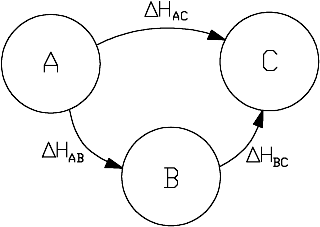 Exemplo: procurar a mudança de associada à transformação . É inútil de medir-la se conhecermos já os calores de . Em efeito, como H é uma função de estado, a o mesmo valor que a transformação de A em C seja efetuada diretamente ou passando pelo intermediário B: