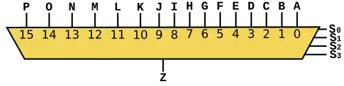Um Mux de dezesseis canais ou entradas é um Mux que conta com quatro variáveis de seleção : n = 2m = 24= 16. A seleção de entradas não depende do nível lógico e desta forma na coluna de saída em vez de serem representados os valores lógicos são apresentadas as variáveis de entrada.