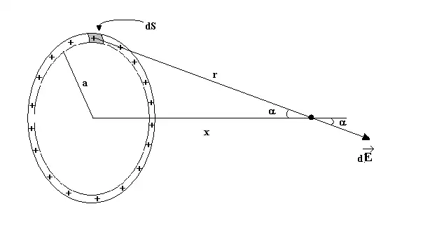 Uma outra situação interessante é a de um anel carregado. Tendo um anel uniformemente carregado (digamos positivamente), calcularemos o campo elétrico num ponto p situado a uma distância x do centro do anel. Vide a figura abaixo: