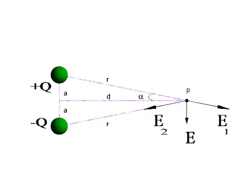 No caso de mais de uma carga agindo no ponto p o cálculo é feito utilizando-se a equação . Um caso de particular importância é quando temos 2 cargas de mesmo valor mas de sinais contrários separados por uma distância 2a (vide figura abaixo). Estudamos o campo elétrico num ponto p a uma distância d qualquer muito maior que 2a situado sobre a mediatriz do segmento que une . A este sistema chamamos de Dipolo Elétrico.