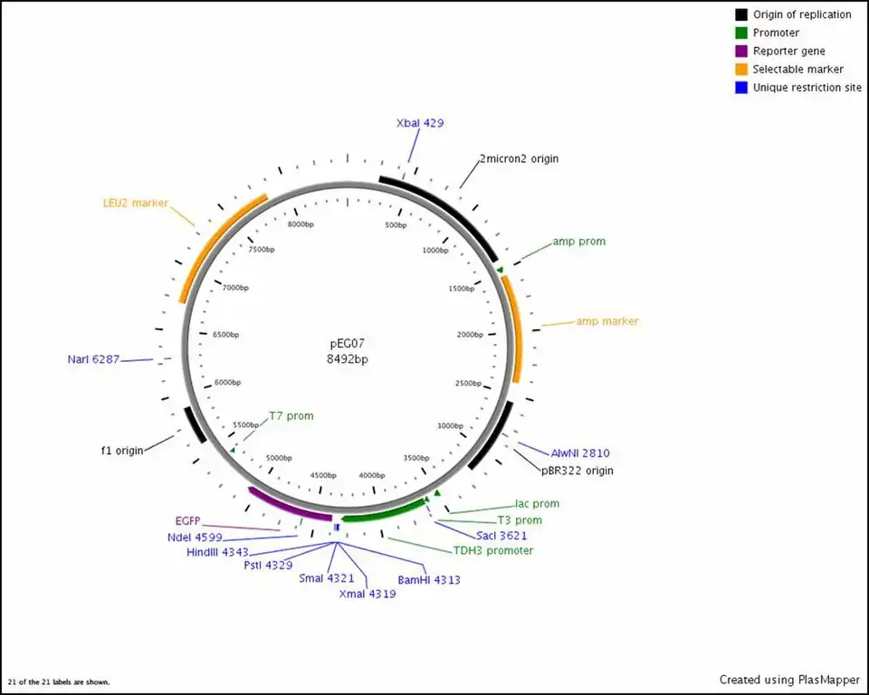 Representação do Mapa de Restrição do Vector pEG07, obtido através do software PlasMapper. O pEG07 é o plasmídeo recombinante construído no âmbito da disciplina de Engenharia Genética, no ano lectivo de 2007/08. Este plasmídeo tem 8492 pb e nele estão coloridas as seguintes regiões: Origem de replicação (preto), Promotor (verde), Gene repórter (Roxo), Marcador de Selecção (amarelo) e Locais de Restrição (azul).