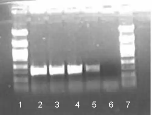 | Quantidade Taq (U) | 1 | 0,85 | 0,65 | 0,35 | 0,15 |