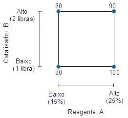 As quatro combinações de tratamento deste desenho, estão representadas gráficamente na figura abaixo. Por convenção denotam-se os efeitos dos factores com uma letra latina maiúscula. Então "A" refere-se ao efeito do factor A e "B" refere-se ao efeito do factor B e "AB" refere-se à interacção entre factores. No desenho os níveis alto e baixo dos factores A e B são representados por "-" e "+" respectivemente nos eixos A e B. Então o sinal - no eixo A representa o nível baixo de concentração enquanto o sinal + no deixo A representa o nível alto de concentração. Pela mesma lógica o sinal - no eixo B representa o nível baixo de catalisador e o sinal + representa o nível alto de catalisador.
