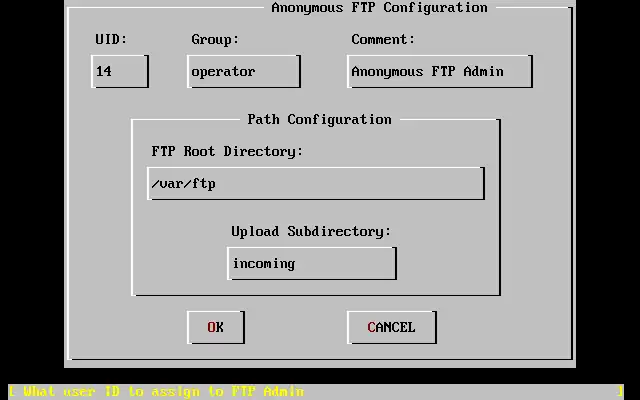 O diretório de FTP raiz será colocado sob /var por padrão. Caso você não tenha espaço suficiente para a demanda prevista de FTP, o diretório /usr pode ser utilizado como base para o Diretório Raiz, ficando /usr/ftp.