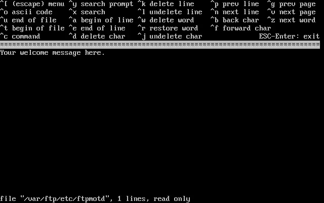 Ao selecionar [ Yes ] e apertar Enter, um editor de texto será automaticamente iniciado, permitindo que você edite a mensagem de boas-vindas de FTP.