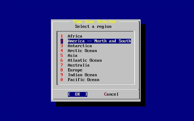 O fuso horário apropriado é selecionado com as setas do teclado e apertando Enter.