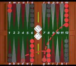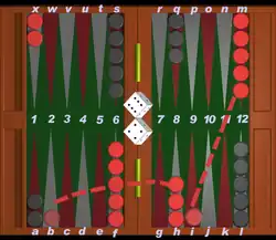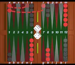 Pode mover uma das peças do início (que, no exemplo, é uma das duas peças da casa X-1 no campo-casa do adversário) movendo-a dez casas para diante; note que dois movimentos são possíveis - marcando primeiro o ponto 4 - para a casa T-5 - e depois o 6 - casa R-7, ou vice-versa (primeiro o 6 e depois o 4), com o mesmo resultado. Estes dois movimentos são possíveis porque ambas as casas (T-5 e R-7) estão "livres", sem nenhuma casa fechada a impedir qualquer das duas movimentações - o que possibilita o uso das opções variadas de jogada, como se verá adiante.