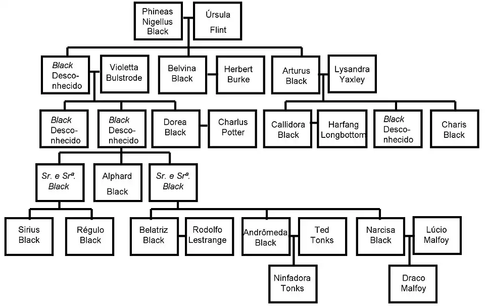Sirius Black mostra a Harrry a árvore genealógica da família Black, numa tapeçaria, localizada na sala de estar em Grimmauld Place. Os membros da família que ele comenta são, Phineas Nigellus Black, tia Elladora Black, Araminta Meliflua Black, seu tio Alphard Black, seus pais, Walburga e Orion, seu irmão Regulus, suas primas Bellatrix, Andromeda (que teve seu nome na árvore queimado, porque se casou com um Trouxa, Ted Tonks) e Narcissa, e o filho de Narcissa Draco Malfoy. Essa árvore genealógica é enorme, e o lema é Toujours Pur - "Sempre Puro". Aqueles como Andromeda e o próprio Sirius que tiveram a coragem de casar ou ser amigo de Trouxas ou nascidos Trouxas, tiveram seu nome queimado da árvore geneálogica, e a própria tapeçaria parece ser colada à parede com um Feitiço Adesivo Permanente.