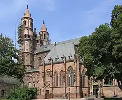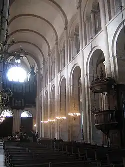 As igrejas românicas em geral também tinham tetos mais baixos que os das igrejas góticas, usavam muito menos vitrais coloridos e, por conta dessas duas características, não precisavam de arcobotantes. As igrejas românicas, como o nome deixa implícito, tentavam parecer com a grande Basílica Imperial de Roma. Isso é evidente nas colunas internas, que são largas e com ranhuras em forma de meia-cana.